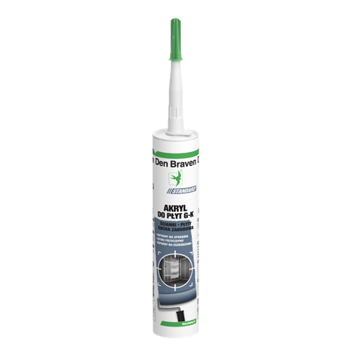 Den Braven Akryl Do Płyt GK to wysoce plastyczno-elastyczny kit uszczelniający na bazie wodnej dyspersji akrylowej, do wypełniania połączeń, naroży, pęknięć i rys w płytach gipsowo-kartonowych, bloczkach oraz tynkach gipsowych