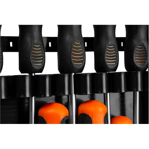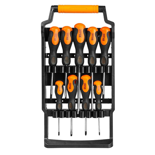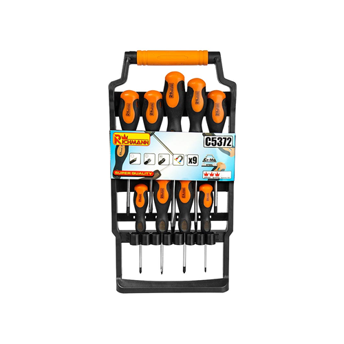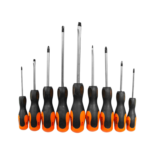 Zestaw zawiera 9 sztuk wkrętaków płaskich oraz krzyżakowych